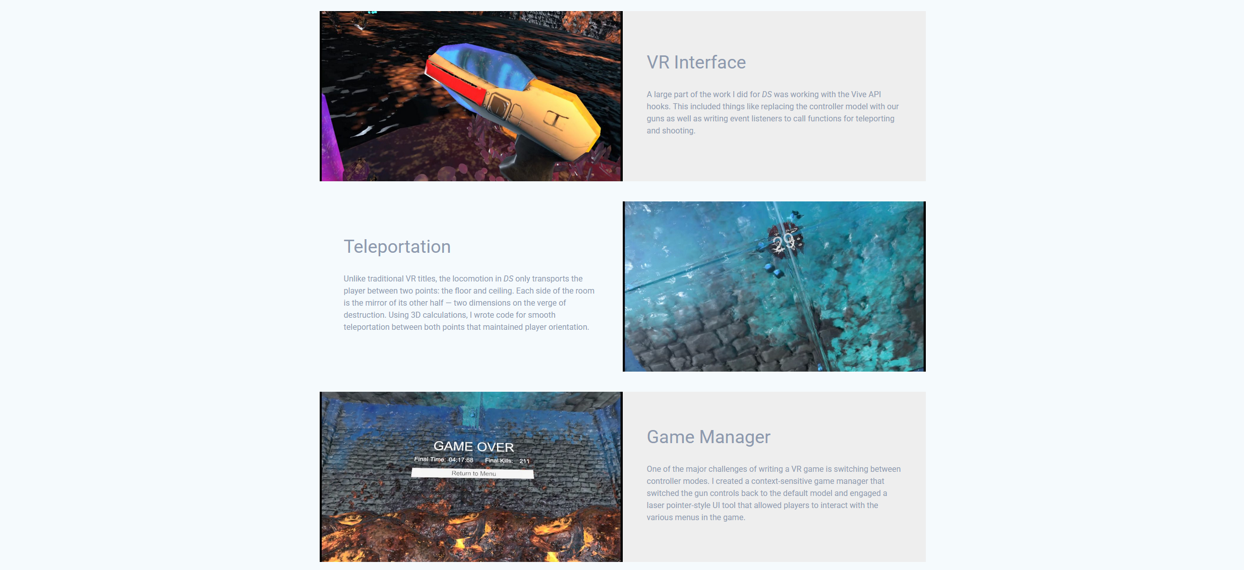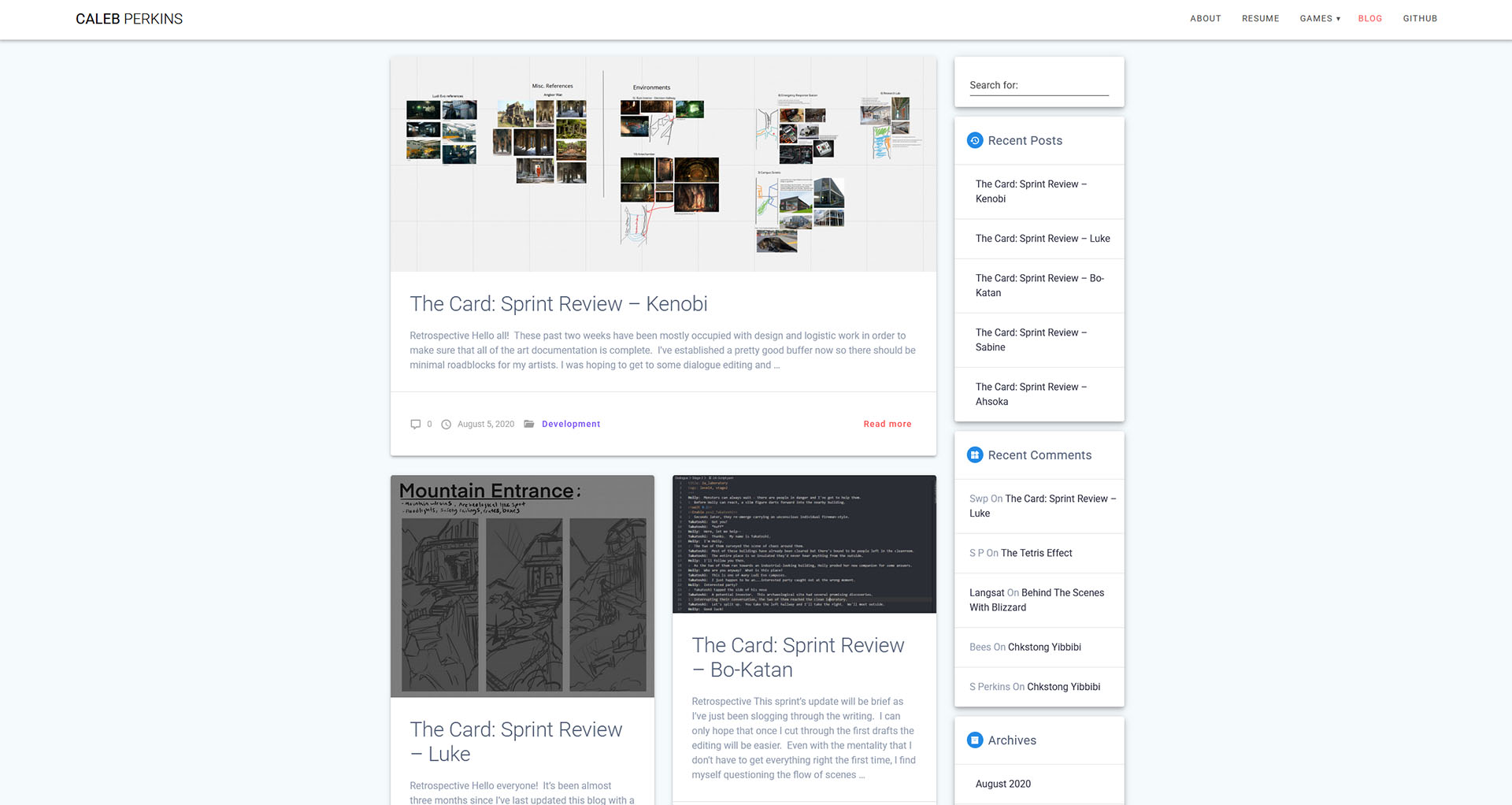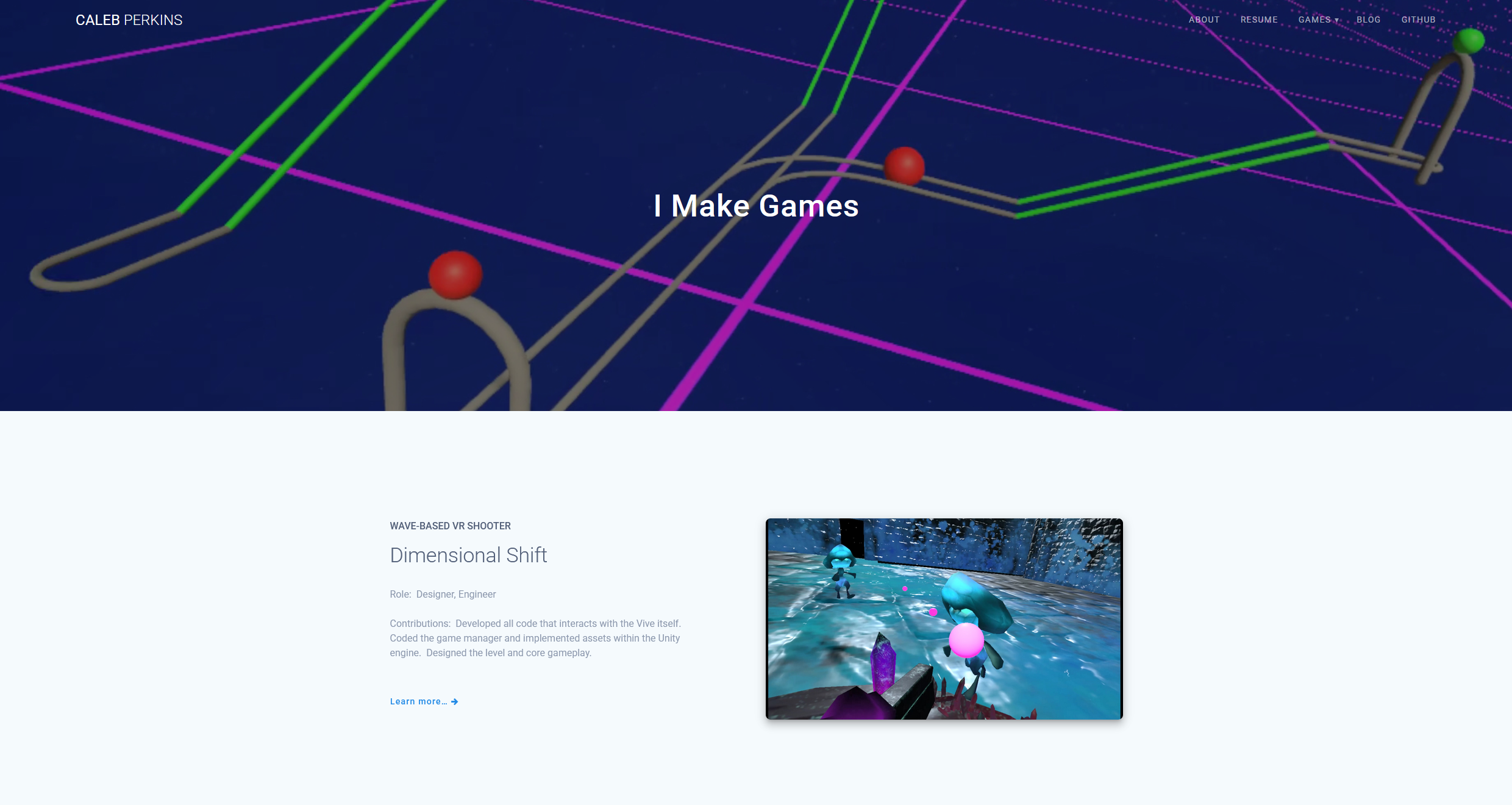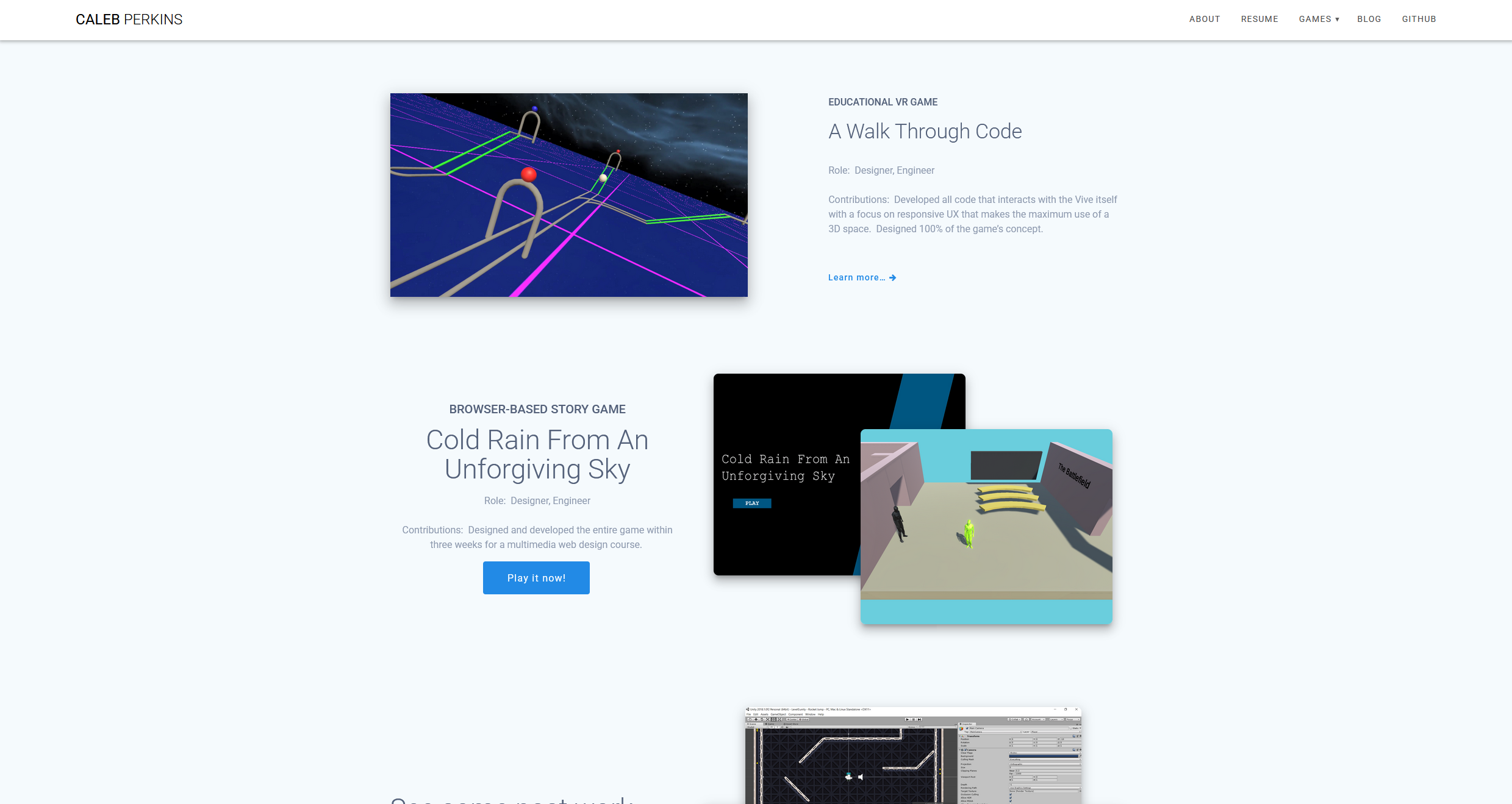 Similar to this website, my goal with caleb-perkins.com was to efficiently display a large amount of projects and gameplay. The clean Materialis theme helped draw focus to the game visuals without unnecessary distraction. WordPress’s freedom to add plugins and edit HTML also allowed me to host WebGL-based games directly on the site, letting visitors play my games without having to download anything.